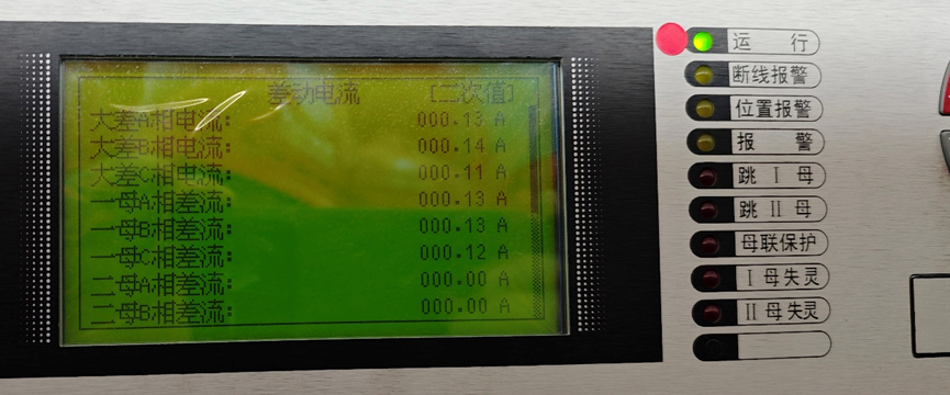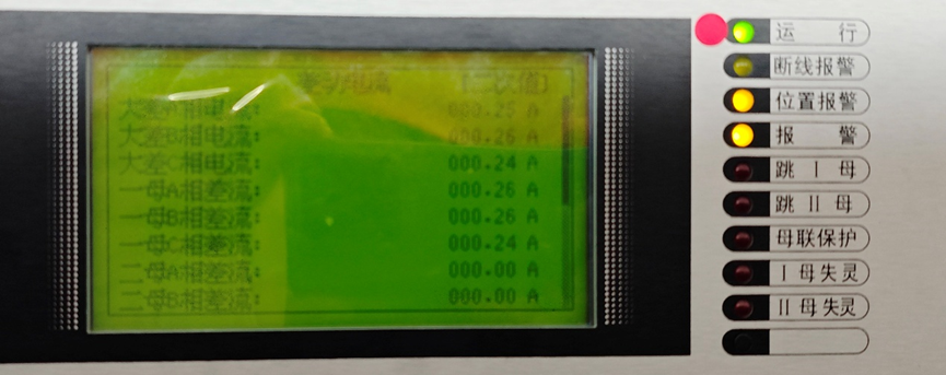 6) Select a lightly loaded operating line as the reference branch. Short-circuit it at the rear of the out-of-service set A bus differential protection panel and isolate it to ensure that the branch current does not flow into set A. Observe the sampling in the set A bus differential protection device, where differential current should appear. Measure and calculate the primary current magnitude and power flow direction of the reference branch. On the bus differential simulation panel, force the operating branch disconnector onto the same bus as the reference branch.