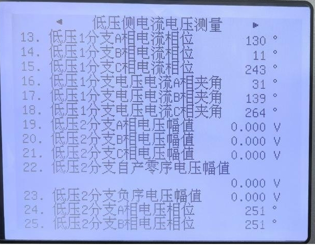 In the figure above, for the CT of the low-voltage side main transformer bay, P1 points to the busbar, and the current flows from P2 to P1— the current is 180° out of phase with the voltage. In addition, due to the Y-to-Δ conversion, the current leads the voltage by 30°; thus, the secondary current angle of the low-voltage side main transformer bay is 270° + 180° + 30° = 120° positive sequence. For the CT of the low-voltage side bay, P1 points to the busbar, and the current flows from P1 to P2— the current-voltage angle is 270° + 30° = 300° positive sequence.