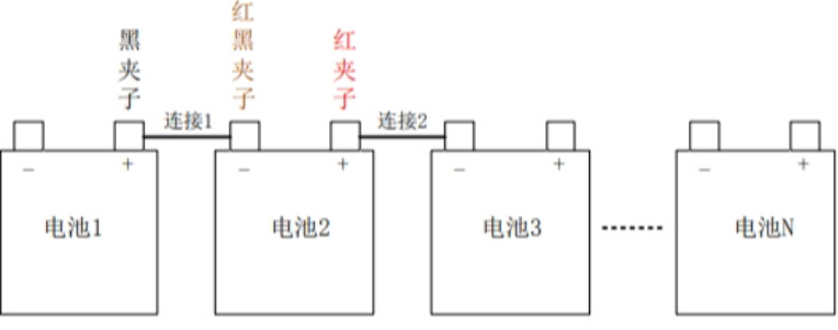 connect the black-red clip and the red clip to the negative pole of the battery under test.