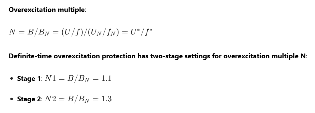 Generally, Stage I protection operates with a time delay to issue a signal and reduce the excitation current of the generator-transformer unit. Stage II protection generally operates to trip the unit, de-excite the generator, and execute programmed tripping. When a shared overexcitation protection device is used for both the generator and the transformer, the setting value is determined based on the component with lower overexcitation capability. The transformer overexcitation protection calculates the overexcitation level using the voltage and frequency of the high-voltage side, while the generator overexcitation protection uses the terminal voltage and frequency of the generator. The overexcitation protection is automatically blocked when a TV (voltage transformer) circuit fault occurs. To eliminate the impact of voltage transients from the high-voltage side TV, the transformer overexcitation protection is blocked by the no-current condition on either the high-voltage side or the low-voltage side (neutral point) of the transformer.