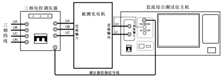 The three-phase electronic voltage regulator is connected in series between the three-phase four-wire power supply and the input of the charger under test. The output of the voltage regulator is connected to the input of the charger under test, and the control signal line of the voltage regulator is connected between the voltage regulator and the host to realize the host's automatic control of the voltage regulator. The DC output of the charger is connected to the current loop and voltage loop of the host respectively.