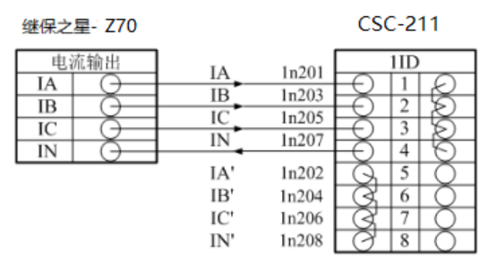Connect the current output terminals "Ia", "Ib", "Ic" of the Relaystar-Z70 to the AC current terminals "IA", "IB", "IC" (polarity terminals) of the protection device respectively. Then short-circuit the AC current terminals "IA'", "IB'", "IC'", "IN'" (non-polarity terminals) of the protection device, and connect the "IN" (zero-sequence current polarity terminal) back to the current output terminal "In" of the tester. Connect the input contact "A" of the tester to the phase-separated trip output contact "Trip A" of the protection device, and connect the "+KM" terminal of the tester to the common terminal of the protection device.