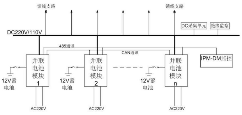 The parallel DC power supply system is composed of the parallel connection of high-voltage output terminals of several parallel battery modules. Each module can be equipped with 12V storage batteries to provide high-voltage DC220V/110V. The system is configured with several DC feeder branches, an insulation monitoring device, a switch quantity monitoring device, a system monitoring touch screen device, etc.